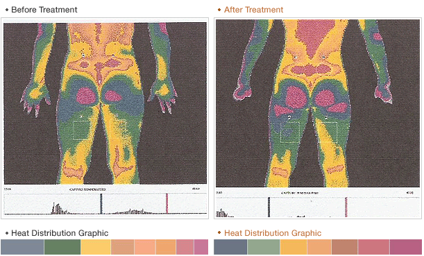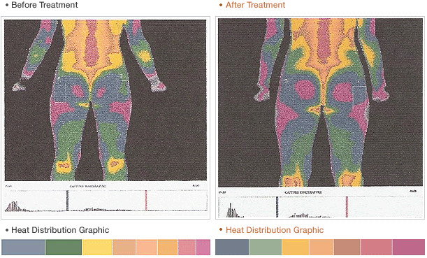 We made a thermographic imaging test through infrared-ray photographing in order to visualize the degree of pain release and the right-and-left alignment of the body.