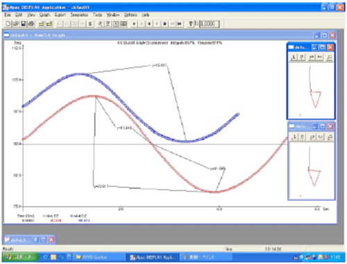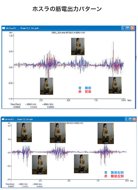In the graph above (HUSLA), just moving left and right slightly increases the side inflective vibration of the spine (distortion angle of shoulder line and pelvis is 17.256¡Æ (right) and 18.629¡Æ (left)) and furthermore, it enables the exercise that moves from central (line of 180¡Æ) point to the side (vertical line in the graph). (Shoulder line: right 6.66¡Æ, left 6.229¡Æ, right pelvis: 17.256¡Æ, left 18.629¡Æ.)